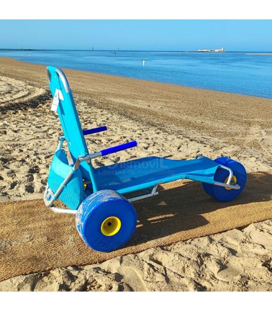 Fabricada en aluminio y acero inoxidable esta tumbona es posible de usarla incluso para facilitar el acceso a piscinas junto a nuestro asistente. El acceso a la playa es también muy fácil pudiendo desde pasear hasta el momento del baño. Su asiento de lona náutica es cómodo, ergonómico e hipoalergénico donde descansaremos cada vez que nos sentemos, y gracias a sus ruedas de gran diámetro y nuemáticas desplazarnos por la arena no será ningún obstáculo.